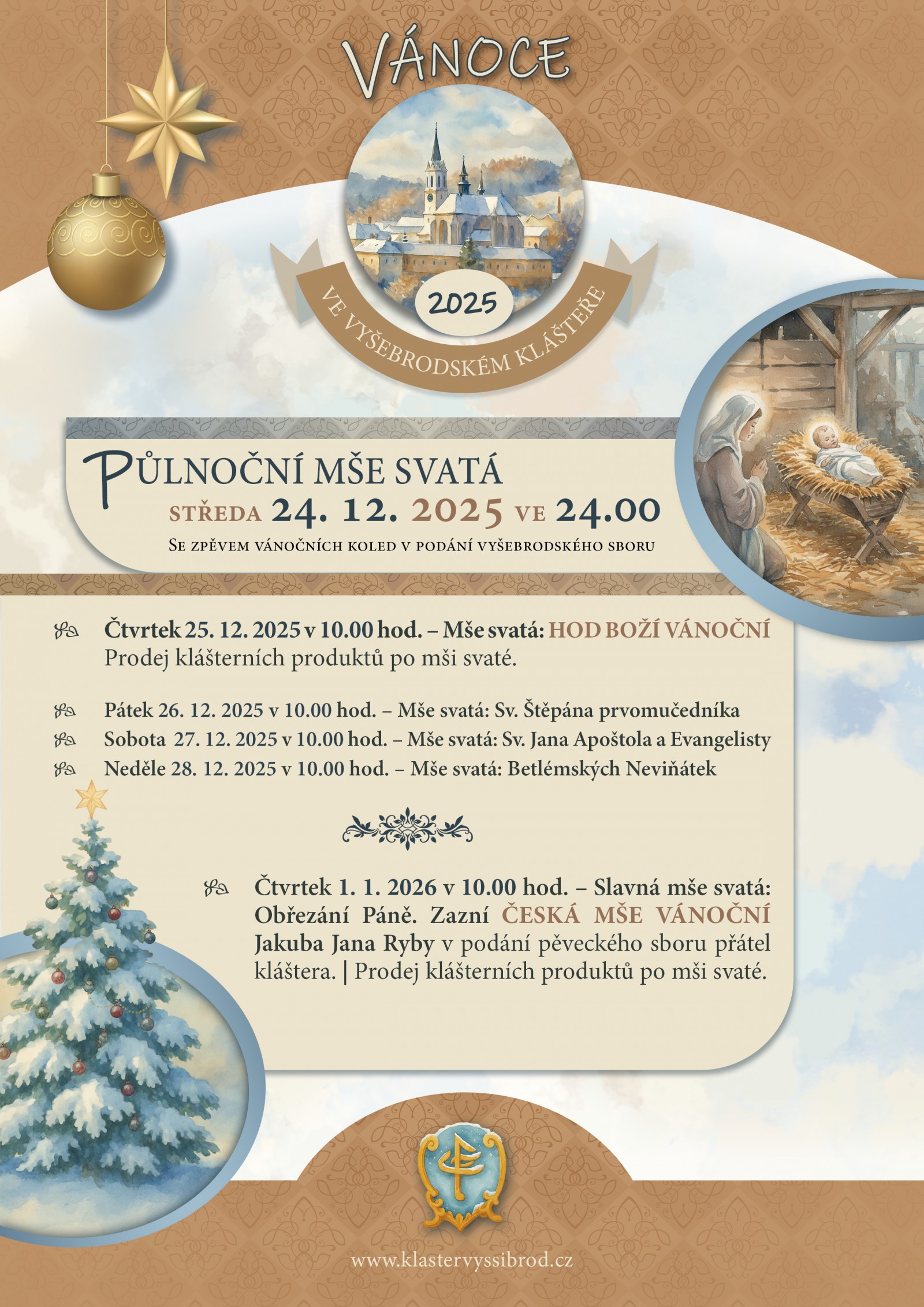 - Středa 24. 12. 2025 ve 24.00 – Půlnoční mše svatá ze svátku Narození našeho Pána Ježíše Krista – se zpěvem vánočních koled v podání vyšebrodského sboru (Nešpory 24. 12. už v 16.30)
